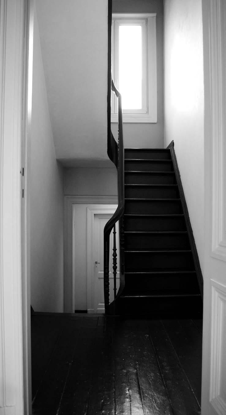 De gang is geplaveid met zwarte tegels, omzoomd door het oorspronkelijke witte marmer. Al gauw zal blijken dat de indeling van het huis er een is waar elke doorgewinterde Zurenborger blindelings zijn of haar weg in kan terugvinden: toegang via zowel een dubbele als een smalle deur vanuit de gang en dan drie kamers achter elkaar.