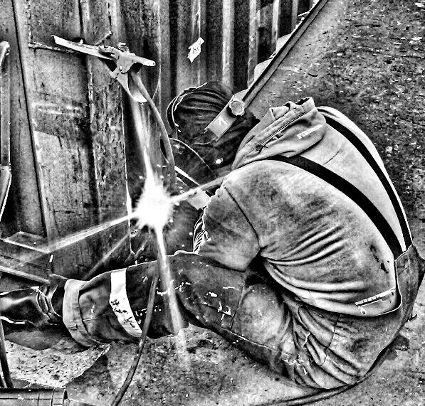Zijn werk in de haven bezorgt Andy niet alleen een vast inkomen, maar heeft hem ook geïnspireerd om zich op de fotografie te focussen. In de haven leef en werk je buiten en kan je honderduit rondkijken. Dat is wat een fotograaf ook doet. De werkpauzes werden kijksessies. Daarop ontstond bij Andy ook de drang om beelden vast te leggen. Hoe heb je dat geleerd? “Je bent een autodidact” roept Sarah vanuit de keuken. We doorlopen een aantal foto’s die afgedrukt klaar liggen om in te kaderen voor de tentoonstelling. De haven is een belangrijke inspiratiebron. Havenarbeiders aan het laswerk. Beelden van opeengestapelde containers, kranen tegen een donkere wolkenhemel. Andy vertelt het in enkele afgemeten zinnen. “Ik zoek doorgaans de donkerte op, maar wil het ook niet te somber maken. Daarom werk ik ook met kleuren. Mensen fotograferen vind ik moeilijk. Het is gênant. Ik vraag altijd of ze akkoord gaan. Maar meestal achteraf.”