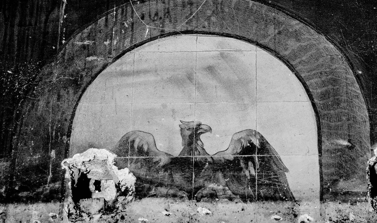 terst rechts, biedt toegang to een vestibule. Links op de muur zijn de restanten te vinden, maar nauwelijks te lezen van een Nederlandse tekst, in gotische letters geschreven. We ontwarren woorden als ‘kruid’ en ‘gift’. Imposante spiegeldeuren leiden naar het achterste deel van het huis. Tegenover de vergane tekst zijn de sporen van een vestiaire nog zichtbaar. Hoogstwaarschijnlijk heeft ook daar ooit een spiegel ingezeten. De gang van het huis is uitgevoerd in het soort mozaïek dat op het einde van de 19de eeuw in de mode was. Je vindt het ook nog terug in de Opera.