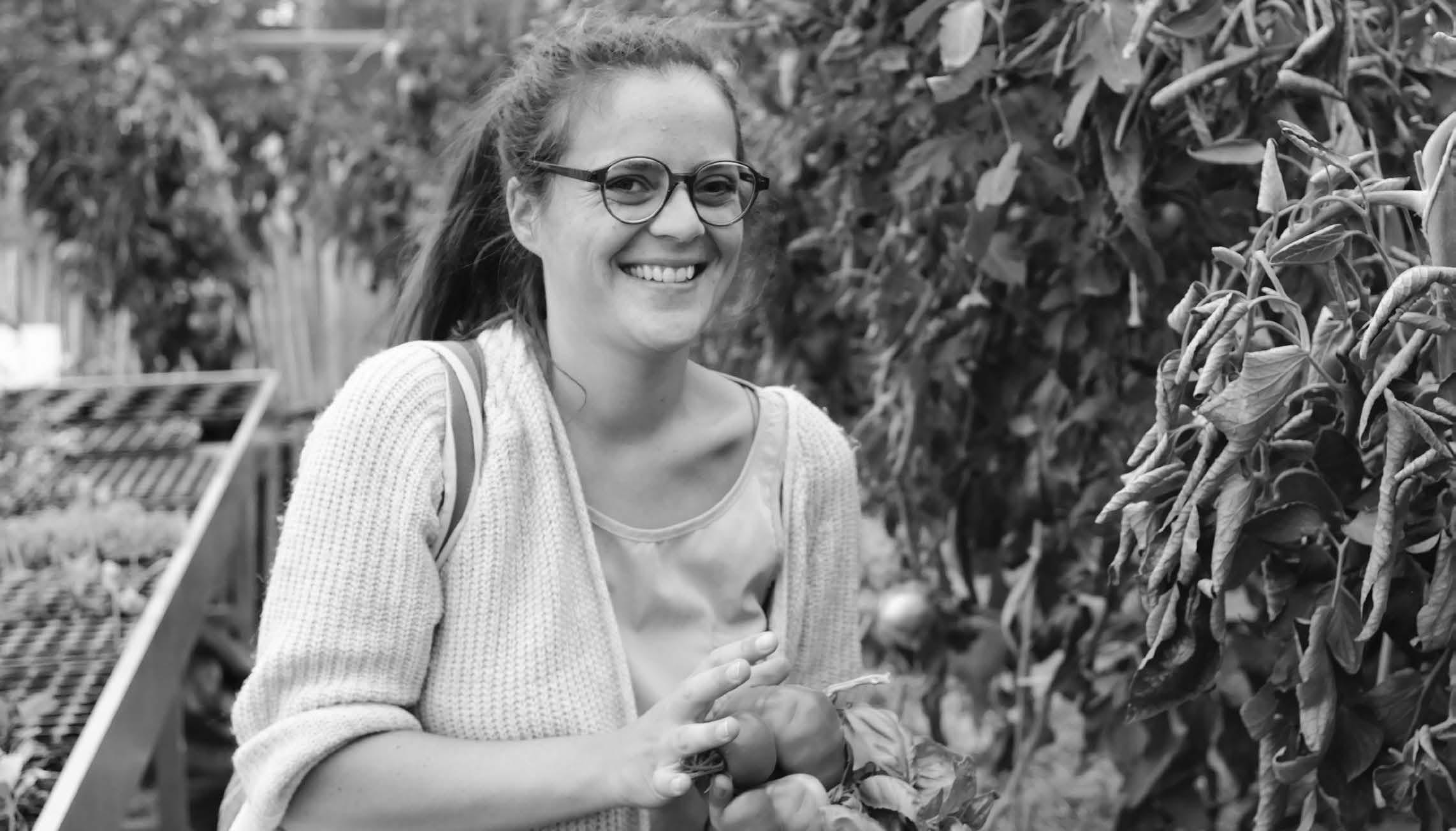 Hanne Pleysier met naast zich een behoorlijke hoeveelheid stokrozen