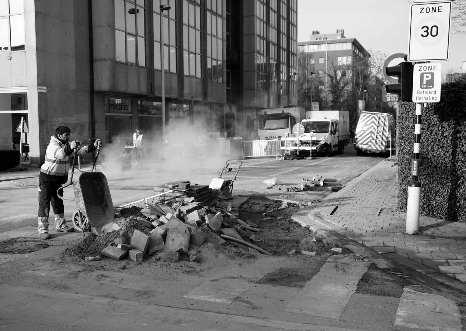 mening vraag over de werken antwoordt die: ”We zullen zien wat het wordt, maar waarom duurt dat allemaal zo lang. Ze zeggen zeker nog tot half maart. Waarschijnlijk mocht het niet vlugger om de kostprijs te verantwoorden.” Zijn reactie lijkt niet zo overdreven, veel moet er niet meer gebeuren: de laatste gaten dichtwerken met beton, dan de straat asfalteren - dat zou volgens de gemeente