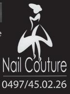 Erkende Medische Pedicure • Professionele Nagelstudio • Massage Studio Josineumuhire@nail-couture.be http://www.nail-couture.be Openingsuren: ma: 11:00 tot 20:00 di: 9:00 tot 18:00 wo: 14:00 tot 18:00 do: 9:00 tot 20:00 vr: 9:00 tot 16:00 Kleinebeerstraat 46, 2018 Antwerpen (Zurenborg) ROLWAGENSTRAAT 79 • 2018 ANTWERPEN Tel. (03) 235 52 54 • Fax: (03) 272 39 10 MAANDAG - VRIJDAG VAN 7U TOT 18U30 ZATERDAG VAN 8U TOT 14U ZONDAG : GESLOTEN NU OOK LOTTO