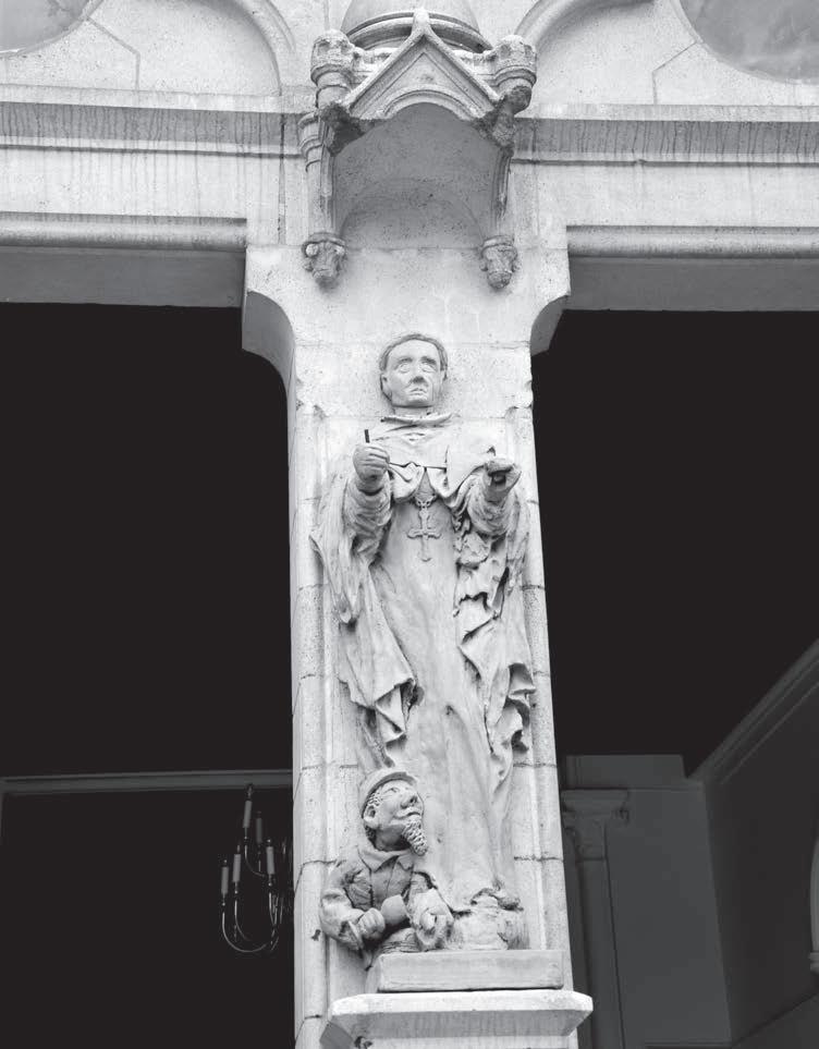 Dit standbeeld aan de kerkdeur zal geen boekenverkopers voorbij zien gaan. Foto Jörg PYL