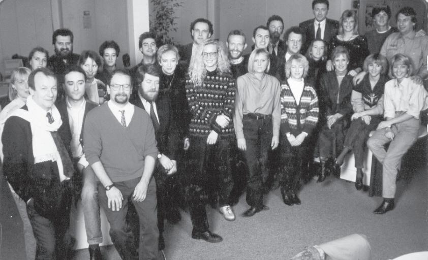 De redactie van 1989: helemaal vooraan hoofdredacteur Jan Schodts met sjaal en rechts bovenaan uw dienaar. • (Eigen foto)