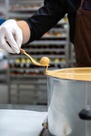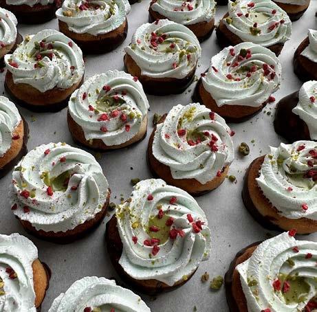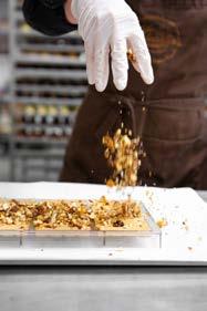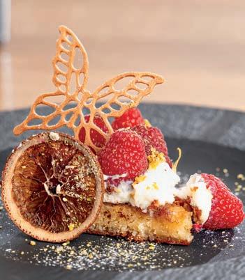 DESSERT Ruby chokoladebar med mazarinbund, hindbærsorbet og guldknas.