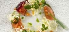 Duet af koldrøget laks med skilt kærnemælkssauce og dildolie, citrusperler samt urteslør og fennikel.