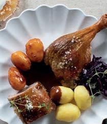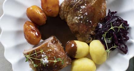 Hos os kan du bestille sprødstegt and og lækkert tilbehør: Hjemmelavet rødkål, hvide og brunede kartofler samt en kraftig andesauce.