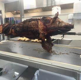 Hovedret, serveres fra buffet: Svinekam, kalvefilet, andebryst, ristede kartofler, rødkålssalat, bagte rodfrugter og skysauce.
