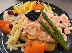 Sild og karrysalat, fiskefilet m/remoulade, dampet torsk m/ dressing og rejer, brød og smør.