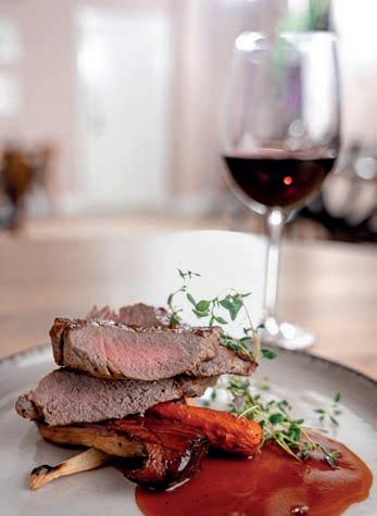 Oksemørbrad serveret med pommes aligot, en trøffelsauce, skovens svampe, rødvinsmarinerede perleløg og romanesco samt en kartoffelkurv med braiseret estouffade.