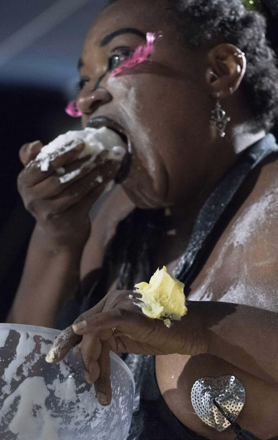 A birthday cake is more than a sugary treat adorned with candles; it is a marker of the passage of time. Accompanied by illusionist and cabaret princess Mona LaDoll, Rébecca Chaillon reimagines the act of baking a birthday cake. She becomes the cake, ingesting the ingredients along with words, letting herself be devoured by the audience. A performance which reflects on the harsh realities of consumption, social pressures carved on bodies, and eating disorders.