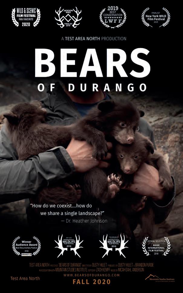 The “Bears of Durango” flm details the research and implications of a Colorado Parks and Wildlife research project aimed at better understanding and addressing increases in human-black bear conficts. Beginning in 2011, a team of wildlife researchers, led by Dr. Heather Johnson, spent six years investigating the factors that drive human-bear conficts and the efects of expanding human development on bear populations. The flm won a series of awards, and the research fndings have impacted discussions on human-wildlife coexistence.