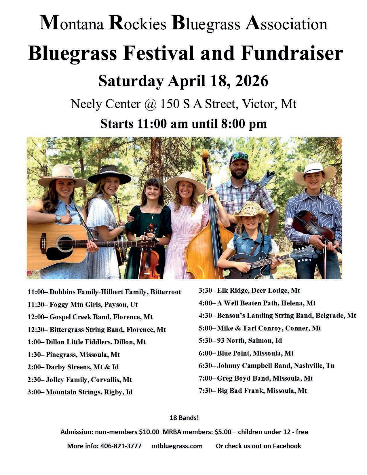 Other bands attending include Mountain Springs, from Rigby, Idaho and Bensons Landing String Band, from Belgrade. Conroy spoke about Blue Point, from Missoula, and added that this last one played at the Hardtimes Bluegrass Festival last year. Hardtimes is an unrelated event, but a few bands end up playing in both. The festival will take place at the Neely Center again, located at 150 A Street, Victor. Music starts at 11 a.m. and runs until 8 p.m. Non-member admission is $10. Members pay $5 and children under 12 enter free. More information is available at (406) 821-3777, the organization website: mtbluegrass.com and the MRBA Facebook.