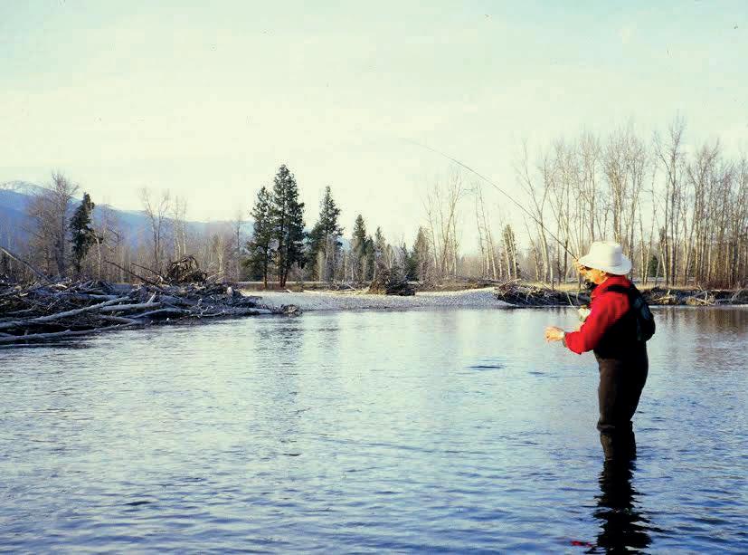 river. Coming from below, it’s as if he were approaching those fsh from upstream. He stopped well short of where he could be seen by the feeding fsh, took of his shoulder pack and laid it on the gravel bar, squatted beside it and retipped his leader and tied on a fy. He remained in that crouched position and crept forward, his silhou-
