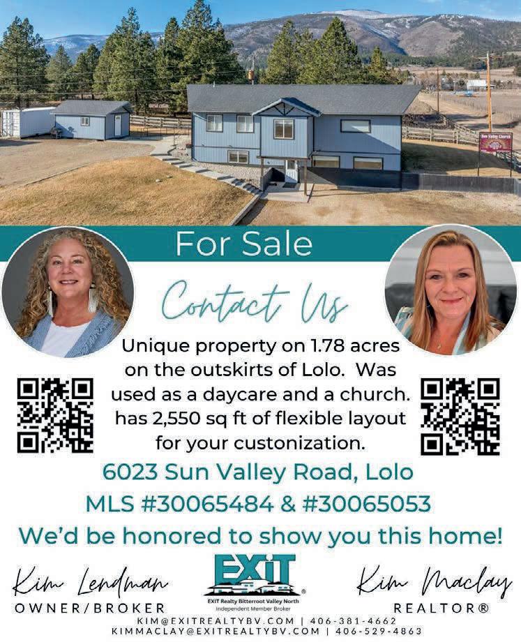We currently have several real estate buyers looking for property in the Bitterroot Valley: 2 buyers for 2+ bedroom home 1+ acres $400K-1M Stevensville to Darby; buyer for home/cabin with live water/fshing access up to $1M buyer for 3 bedroom home on 10+ acres up to $2.5M Florence to Hamilton area. Outbuildings are a plus. Call us if you have a property to sell that might work. For sale 320 /- acres in the southern itterroot Valley, borders Forest Service lands, Hunting District 270, wet draw with small spring, several potential building sites, top of the world views. $2,000,000 price re ects being burned in fres of 2000.