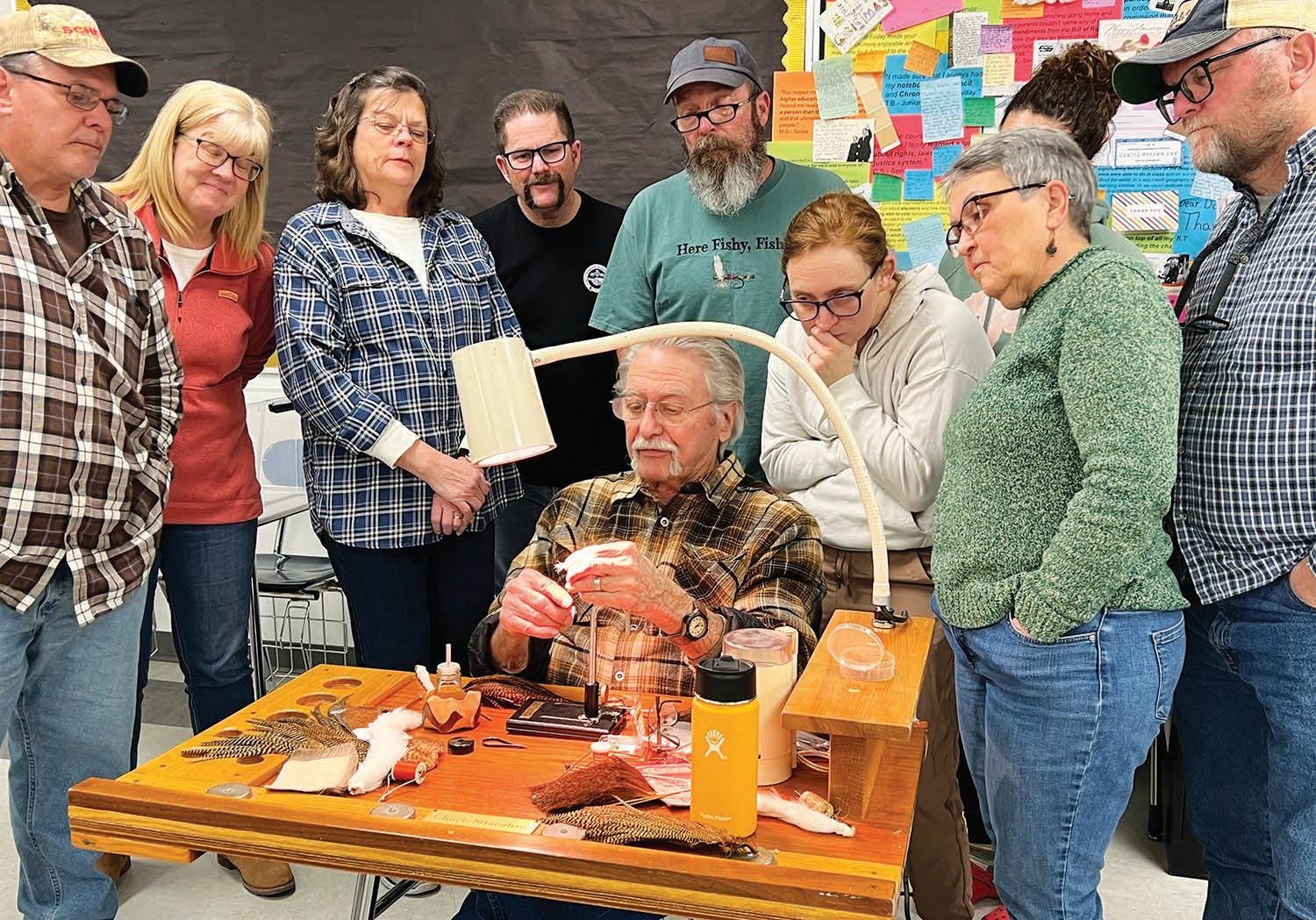 Wes’ presentations are packed with information displayed on PowerPoint images while he circulates among the students. It’s that personal interaction, those hands-on individual instructions that are priceless. It’s hard to learn the fne points of fy tying any other way.