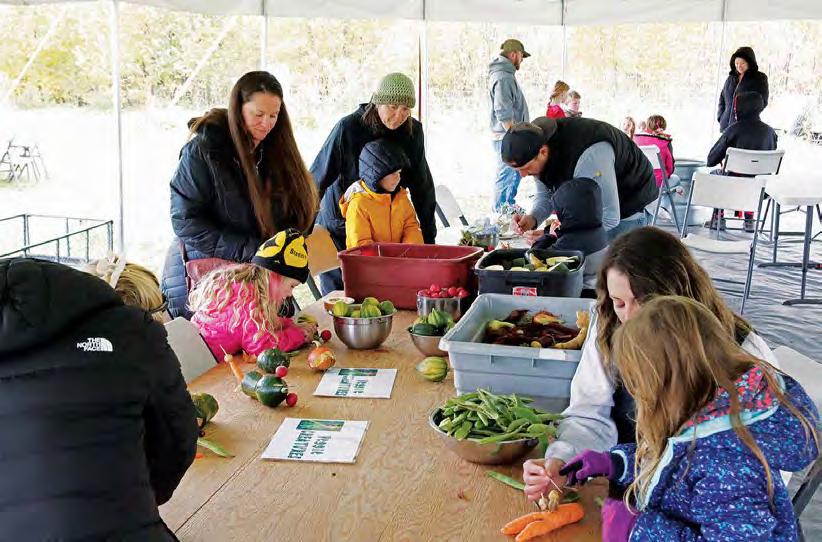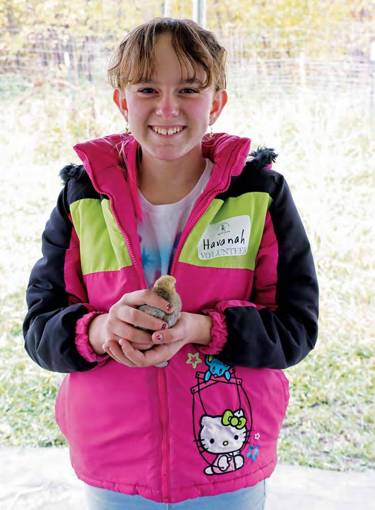Above, visitors take part in the vegetable sculptures part of the event. Below, Havanah Davis, a youth intern with Cultivating Connections Montana, holds a baby chick and mans the booth where young children can interact with baby birds. Photos by John Dowd.