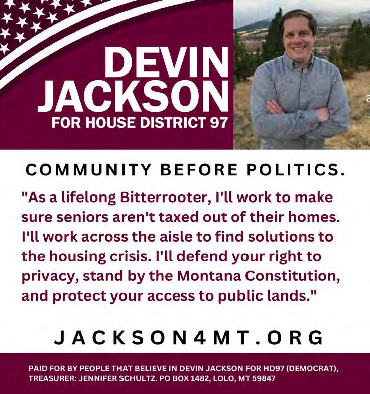 all see the open Valley land disappear ing and changing. Regardless if you’re a native or call the Valley home now, I would like to ask you to think about what you are willing to invest to keep the Bitterroot Valley open for gener ations to come and VOTE YES on the Ravalli County Open Lands Bond on November 8th.