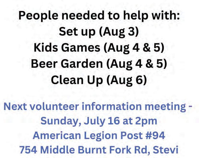 The Stevensville Civic Club is looking for volunteers to help out with the Creamery Picnic which takes place at the beginning of August. Help is needed for set up, kids games, beer garden, info booth and clean-up. Shifts will take place between August 3rd and 6th and are mostly in two-hour blocks. An informational meeting will be held Sunday, July 16 at 2 p.m. at the American Legion Hall, 754 Middle Burnt Fork Road, Stevensville. You can also fnd more information on the internet at stevensvillecivicclub.com or on the Creamery Picnic facebook page.