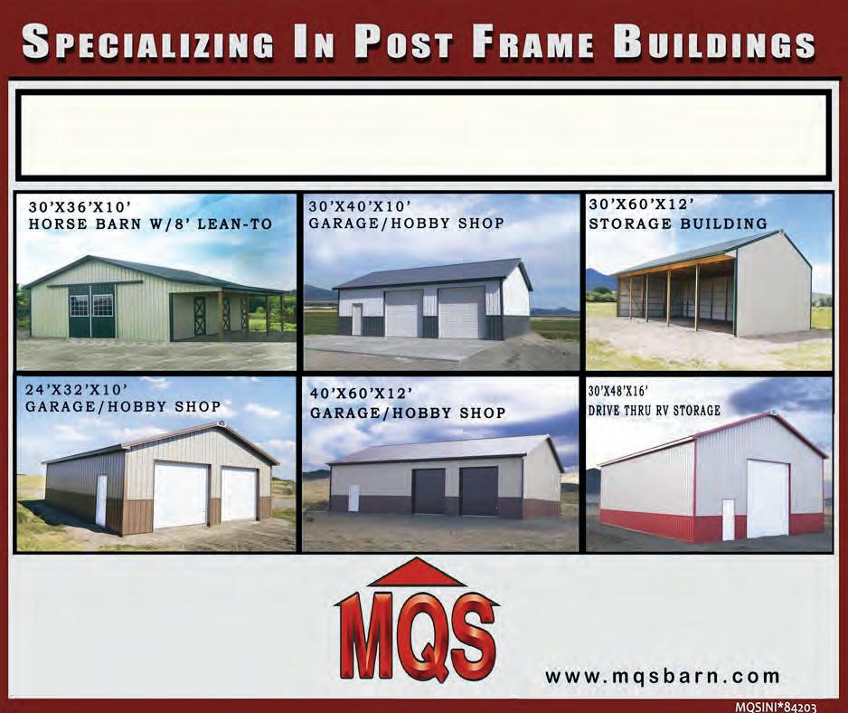60 x 100 x 16 $99,500 80 x 152 x 16 $199,500 24 x 32 x 10 $21,900 30 x 40 x 10 $27,900 40 x 60 x 12 $45,900 50 x 80 x 16 $69,500 70 x 120 x 16 $139,500 AG SPECIALS THE LISTED COSTS INCLUDES INSTALLATION OF THE BUILDING PRICES MAY VARY DUE TO LOCATION WAINSCOT, CONCRETE & SIDELITE BELT PICTURED IS NOT INCLUDED IN STARTING COST PRICES LISTED ARE STARTING COSTS AND MAY VARY 30 x 36 x 10 $39,900 | Horse Barn | 30 x 60 x 12 $27,900 | Storage Building | 2023 Specials 30 x 48 x 16 $38,900 Drive Through | RV Storage | 855-677-2276 www.MQSBARN.com