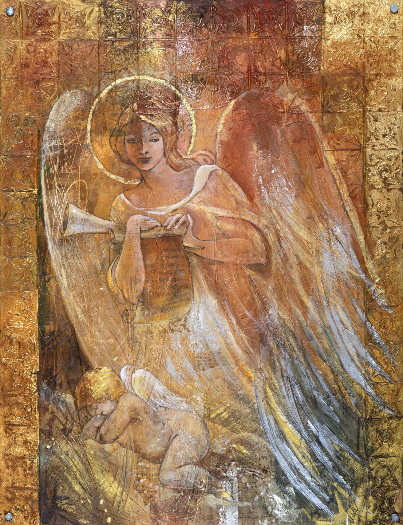En su mundo de ángeles, la iluminación no es pasiva, sino explosiva. Como si un sol interior se detonara. Como si los aludidos cumplieran una condena divina durante un instante eterno. Las espaldas de sus figuras ovilladas, rendidas, se agrietan igual que un capullo y emergen las alas: son ángeles recién caídos, desdichados, desengañados, expulsados del amor, donde escurre el llanto polícromo de Cuka.