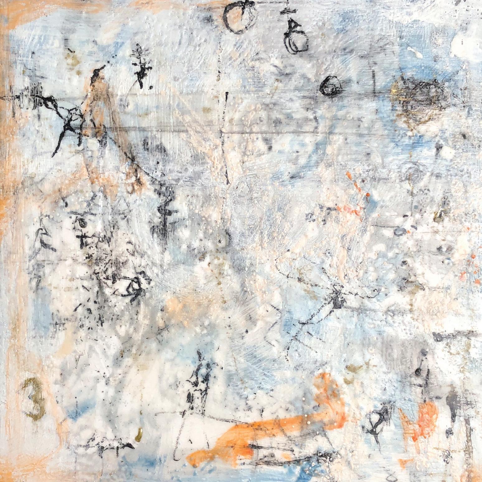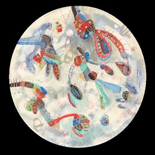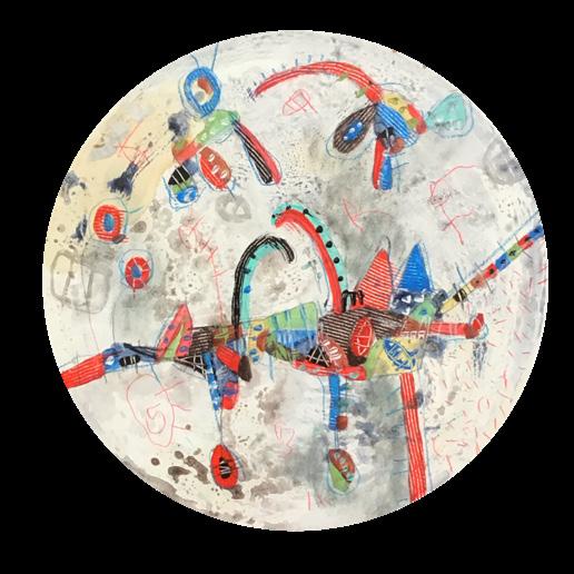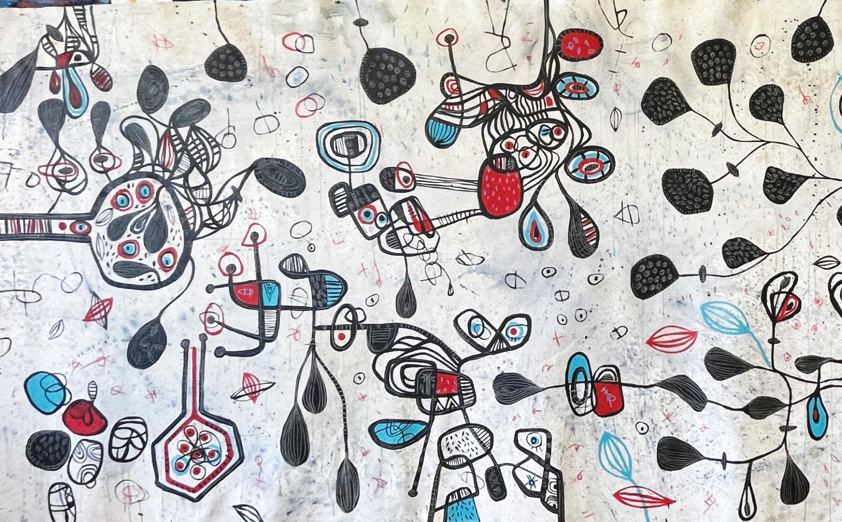 Sobre un fondo velado de colores primarios y atmosféricos, sus dibujos flotan como alegres formaciones características de la creatividad infantil. Juguetones grafismos lineales serpentean a través del plano, donde números y letras aparecen como signos mágicos. La composición y la reproducción de los detalles son azarosos, manifiestan una tendencia estilizada en que las formas se contraponen claramente.