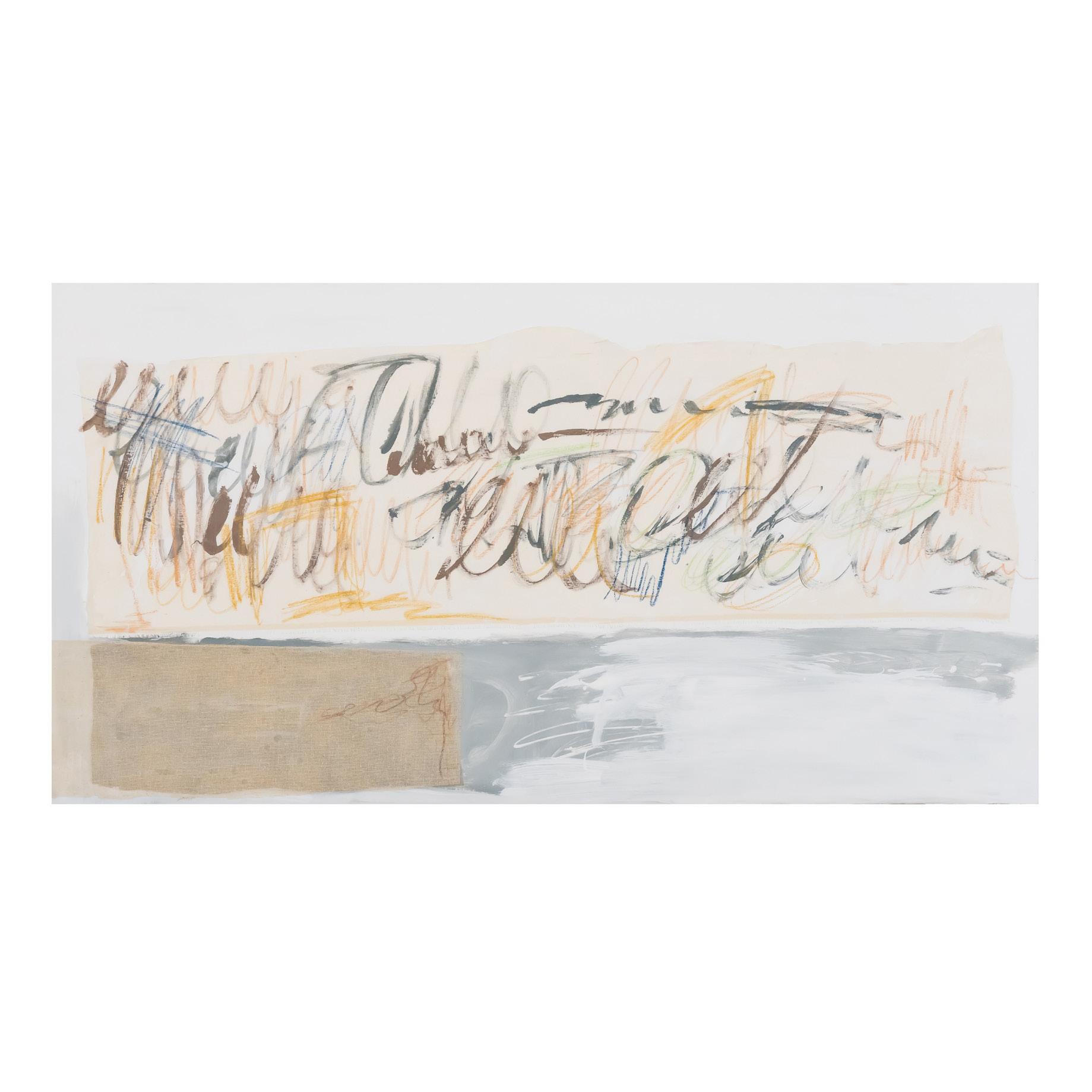 Collage con fragmentos de tela, pastel y acrílico sobre lienzo