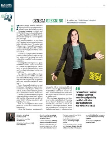 or most people, entering the family business usually means assuming a place in some well-oiled company. For Genesa Greening, president and CEO of BC Women’s Hospital Foundation, following in her parents’ footsteps meant embarking on a life steeped in philanthropy. “My parents were both in social service; they were both ordained ministers in the Salvation Army,” Greening said. “I always knew I wanted to change the world even though I probably couldn’t articulate how big that world was when I was small.” A desire for change carried her away from traditional schooling and helped her tenaciously achieve her goals without the benefit of post-secondary education. Greening’s fundraising success spans over two decades. She has cultivated growth and innovation at a wide array of hospital foundations, nonprofits and social justice organizations worldwide. Her expertise garnered her a role as an instructor at the British Columbia Institute of Technology for fundraising and not-for-profit management programs, a position she held for seven years. Today, Greening leads a team of 22 at BC Women’s Hospital & Health Centre Foundation. In just a year at the foundation, she has achieved 100% growth and a 250% rise in revenue projections. “I’ve always been able to find somewhere where there is a gap and I’ve been able to utilize either my natural skill set or my ability to bring amazing people together,” she said. Now, she is using those skills to improve the health of all women across the province. “I hold the idea that we can really