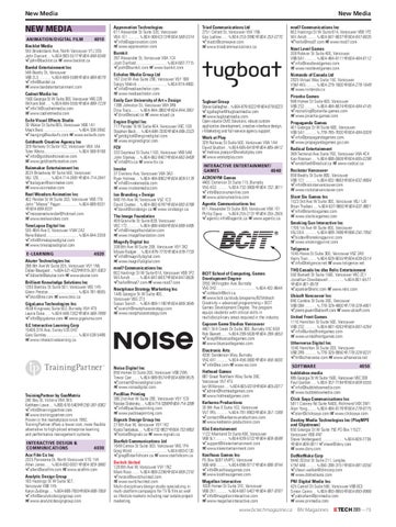 Appnovation Technologies 611 Alexander St Suite 320, Vancouver V6A 1E1 ........... 604-568-0313 604-568-0314 info@appnovation.com www.appnovation.com Burnkit 397 Alexander St, Vancouver V6A 1C4 Josh Dunford .............................. 604-687-7715 josh@burnkit.com www.burnkit.com Echelon Media Group Ltd 167 2nd W Ave Suite 290, Vancouver V5Y 1B8 Sergiy Melnik ............................. 604-874-4800 info@mediaechelon.com www.mediaechelon.com Emily Carr University of Art + Design 1399 Johnston St, Vancouver V6H 3R9 Dina Tracy........ 604-844-3800 604-844-3801 dina@ecuad.ca www.ecuad.ca Engine Digital Inc 717 Pender St W Suite 404, Vancouver V6C 1G9 Stephen Beck ..... 604-684-3330 604-685-3323 getdigital@enginedigital.com www.enginedigital.com FCV 333 Seymour St Suite 1100, Vancouver V6B 5A6 John Starkey ... 604-662-8407 604-662-8409 info@fcv.ca www.fcv.ca Invoke 37 Dunlevy Ave, Vancouver V6A 3A3 Ryan Holmes ... 604-484-8902 604-909-5178 info@invokemedia.com www.invokemedia.com Ion Branding + Design 948 7th Ave W, Vancouver V5Z 1C3 David Coates ... 604-682-6787 604-682-6769 david@iondesign.ca www.iondesign.ca The Image Foundation 409 Granville St Suite 828, Vancouver V6C 1T2............ 604-688-4484 604-688-4485 info@imagefoundation.com www.imagefoundation.com Magnify Digital Inc 338 8th Ave W Suite 208, Vancouver V5Y 3X2 Moyra Rodger .... 604-879-7770 604-879-7733 info@magnifydigital.com www.magnifydigital.com mod7 Communications Inc 602 Hastings St W Suite 614, Vancouver V6B 1P2 Wil Arndt ......... 604-647-6637 604-647-6635 hello@mod7.com www.mod7.com Nextphase Strategy Marketing Inc 1445 Georgia St W Suite 400, Vancouver V6G 2T3 Susan Sorich ... 604-669-1180 604-669-3645 ssorich@nextphasestrategy.com www.nextphasestrategy.com