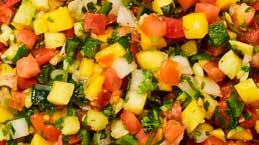 diced tomato, mango, pineapple, yellow onion, cilantro, lime juice, poblano pepper