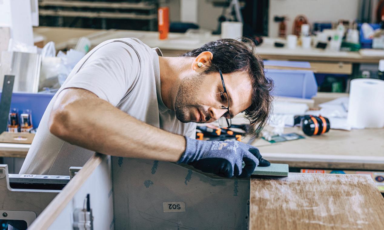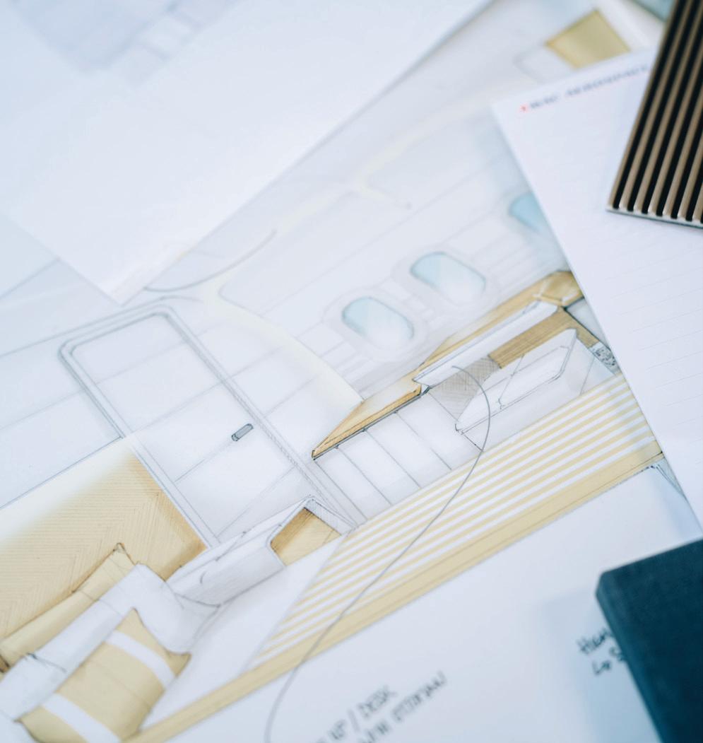 horizontally. This horizontal application is not the typical installation method for veneer, posing a challenge for the team. The design had to seamlessly blend the veneer’s dynamic grain pattern with the rest of the cabin.