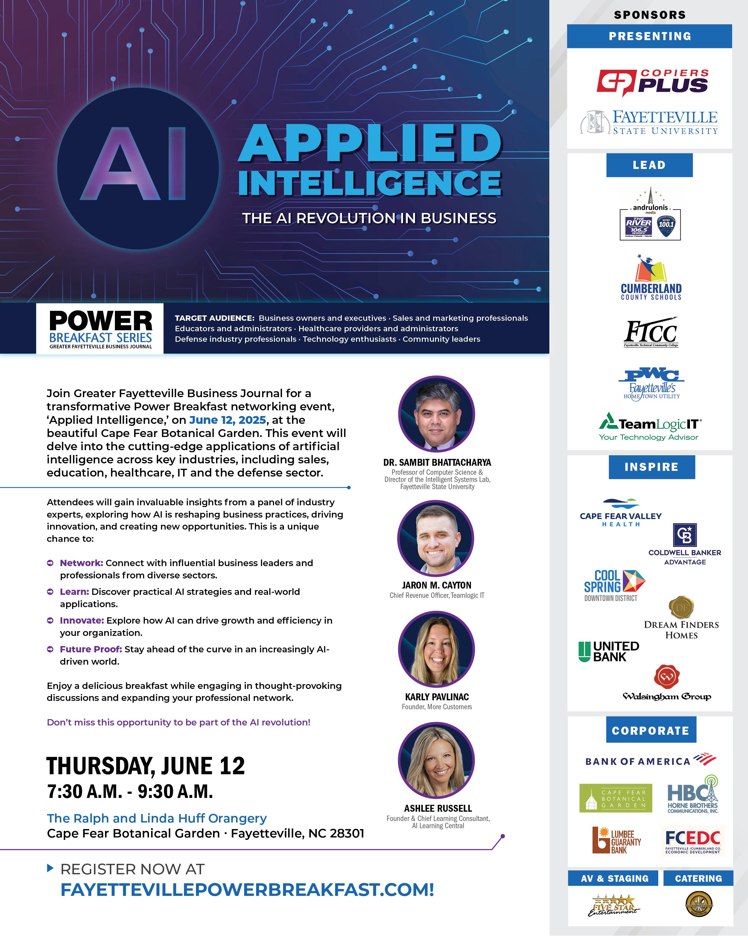 The Greater Fayetteville Business Journal is published twice a month throughout Fayetteville and the Cumberland County region. News related to the region’s business sector is posted daily at bizfayetteville.com.