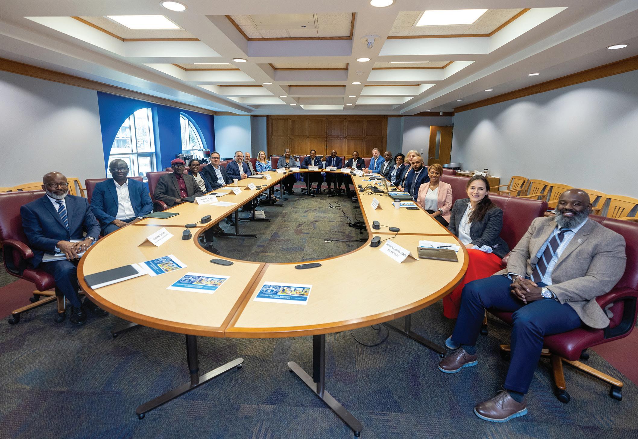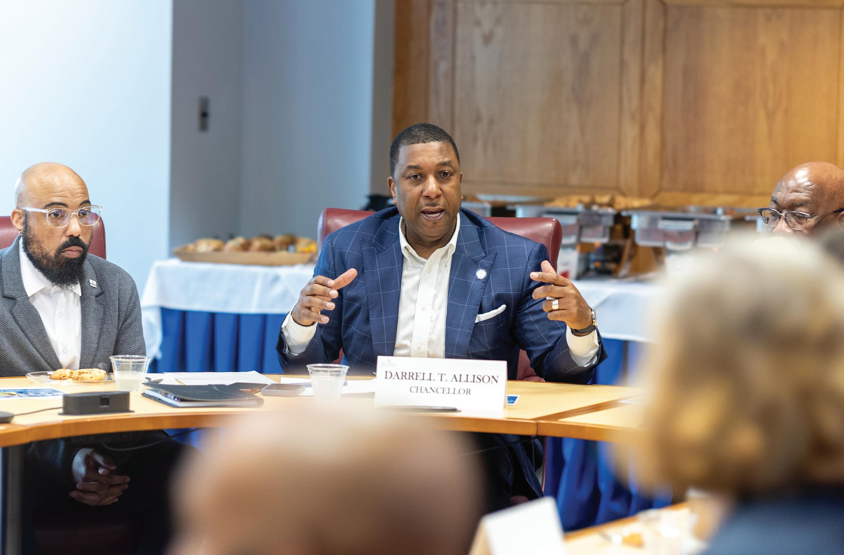 Fayetteville State University Chancellor Darrell T. Allison addresses more than 20 community partners, faculty and staff during the meeting, highlighting the importance of teamwork in bringing this degree program to FSU.