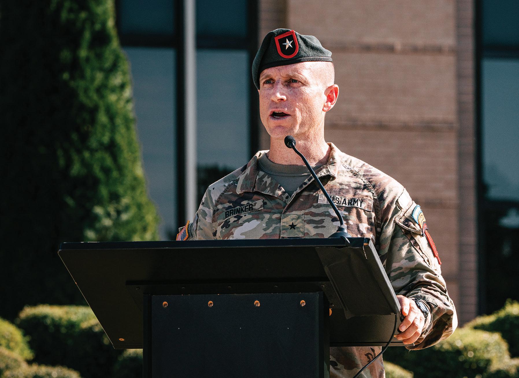 L to R: In an intimate ceremony, the U.S. Army Special Operations Command bid farewell to Lt. Gen. Jonathan Braga after four years serving as the commanding general. The relinquishing of command is a military tradition, which allows the commander and his unit the opportunity to bid farewell. Pictured from left to right: Lt. Gen. Jonathan Braga, outgoing USASOC Commander, Command Sgt. Maj. JoAnn Naumann, USASOC CSM and Brig. Gen. Kirk Brinker, Acting USASOC Commander; U.S. Army Special Operations Command Acting Commanding General, Brig. Gen. Kirk Brinker, gives a speech as USASOC bids farewell to Lt. Gen. Jonathan Braga after serving four years as its commanding general outside the USASOC Headquarters at Fort Bragg, N.C.