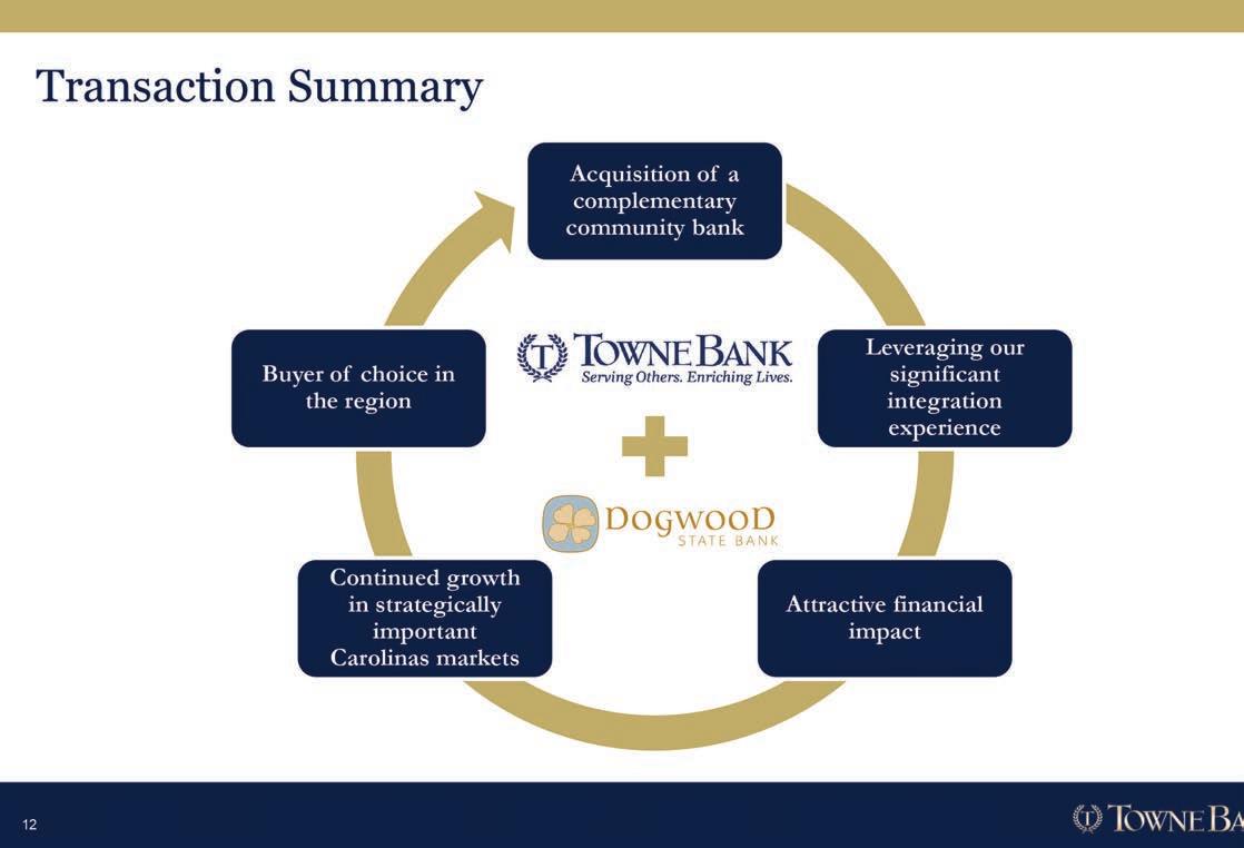 Extensive due diligence was performed by the management teams of TowneBank and Dogwood in regard to the transaction. The definitive agreement was approved by the boards of directors of TowneBank and Dogwood. The transaction is expected to close in early 2026 and is subject to customary conditions, including regulatory approval, as well as the approval of Dogwood’s shareholders.