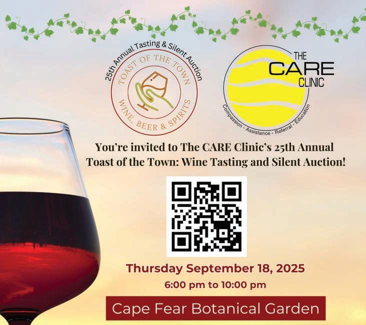 Toast of the Town is scheduled for Sept. 18, 6-10 p.m. at Cape Fear Botanical Garden. Tickets are $100. Information about sponsorship opportunities and volunteer positions is available through The CARE Clinic. Learn more at www. thecareclinic.org/event/25th-annualtoast-of-the-town.