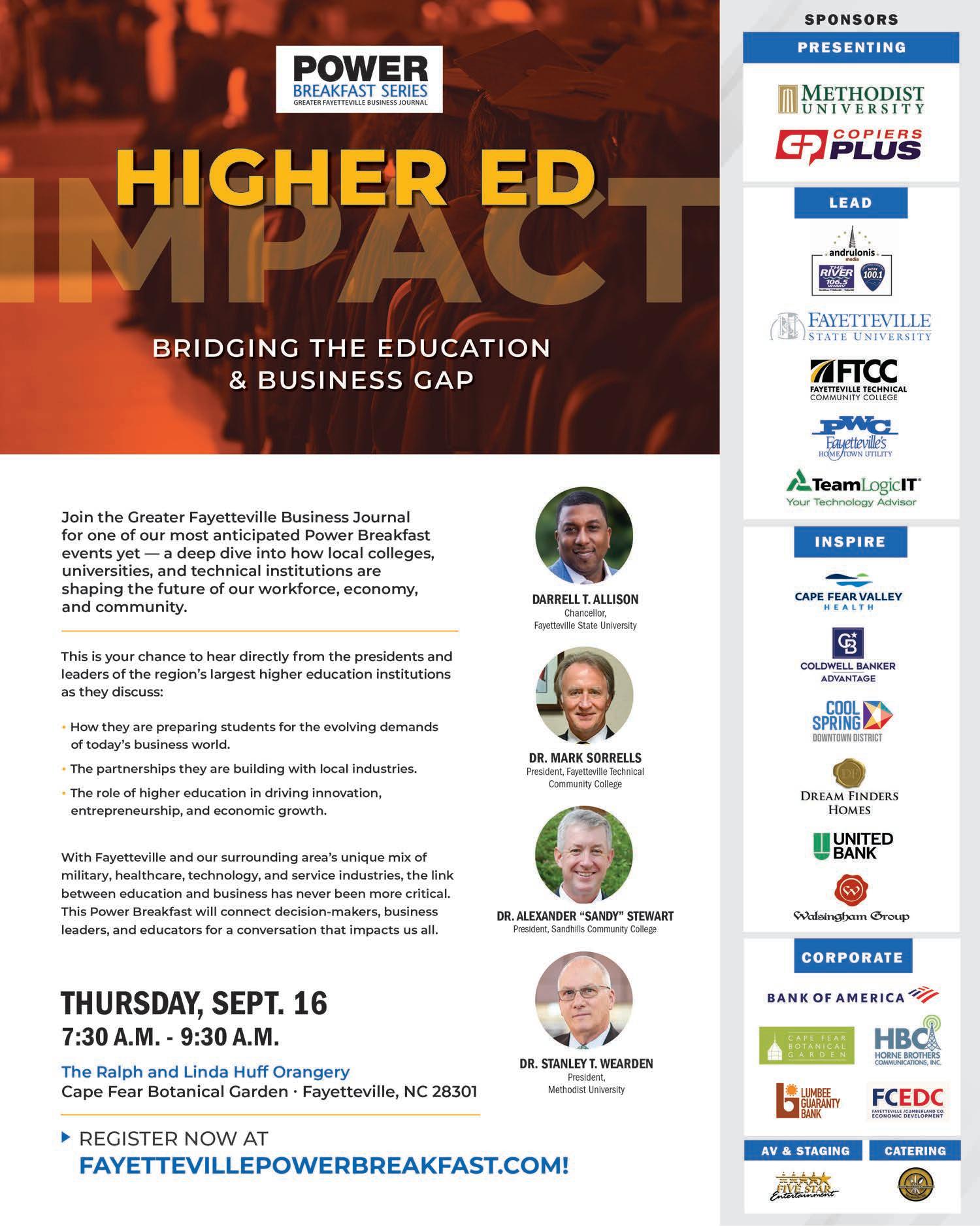 “In the past few years, higher education has been scrutinized more heavily. More and more focus has been placed on its relevance in relation to job placement for graduates and how that intersects with a tightening workforce,” shared Marty Cayton, publisher of the Greater Fayetteville Business Journal. “In this Power Breakfast, we’ll hear from the higher education leaders from our area on how their institutions are handling these changes and making a significant difference in our local economy and business community.”