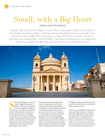 ‘Small, with a big heart’ is Mgarr's motto. This small, quiet village in the north of the island is a farming village, offering some great walking routes around the area. It boasts archaeological sites and promises some of the best examples of what is arguably our national dish, ‘ stewed rabbit’. And Mgarr’s strawberries are simply the tastiest, so sought after that they even have their own festival these days! 01