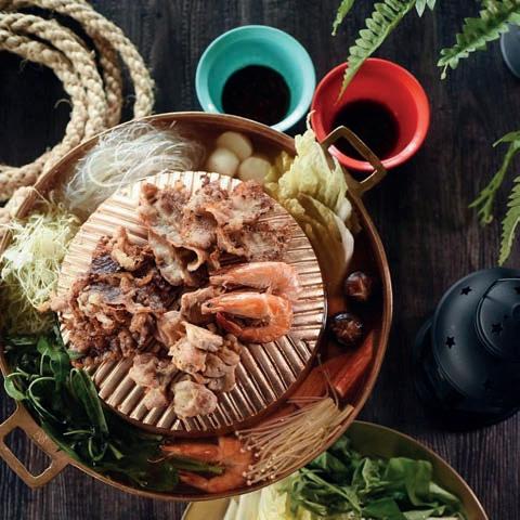 voorkeur eerst gemarineerd werden. Daaromheen, als een soort slotgracht, een ring waar je een heerlijke bouillon of kokossoep in doet. Die wordt steeds smaakvoller door de braadsappen die er in druipen. Op den duur zal je fantastische umamismaken waarnemen. In de verrijkte soep bereid je dan à la minute allerlei ingrediënten, zoals paksoi, champignons, taugé, deegwaren en fijngesneden groenten. Het lijkt wel een combinatie van steengrillen en fonduen in Asian style.