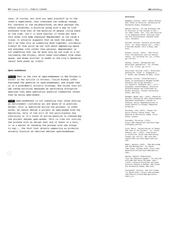 References Agamben, Giorgio (2000). Means Without End: Notes on Politics. University of Minnesota Press, Mineapolis. Babias, Marius. "On the Strategic Use of Politics in the Context of Art". In: IKSV (2005). Art, city and Politics in an Expanding World, Writings from the 9th International Istanbul Biennial, Istanbul. Barthes, Roland. "Authors and Writers 1960". In: Susan Sontag (ed.) (1982). A Barthes Reader. Hill & Wang, New York. Bishop, Claire. (2006). "The Social Turn: Collaboration and its discontents". In: Artforum Vol. 44, 2/2006, pp. 178–183. Bishop, Claire. "Antagonism and Relational Aesthetics". In: October, Vol. 110, 3/2004, pp. 51–79. Bourriaud, Nicolas (2002). Relational Aesthetics. Trans. S. Pleasance & F. Woods. Les Presses du Réel, Dijon. Deleuze, Gilles. "Intellectuals & Power (A conversation between Michel Foucault and Gilles Deleuze)." In: Donald F. Bouchard (ed.) (1977). Language, Counter-Memory, Practice: Selected Essays and Interviews by Michel Foucault. Cornell University Press, New York. Erdog ˘an, Necmi (ed.) (2002). Yoksulluk Halleri: Türkiye'de Kent Yoksullug ˘unun Toplumsal Görünümleri [States of Poverty: Social Representations of Urban Poverty in Turkey] Demokrasi Kitaplıg ˘ı. Holloway, John (2002). Change the World without Taking Power. The Meaning of Revolution Today. Pluto Press, London. Kravagna, Christian (1998): http://www.republicart.net/disc/aap/ kravagna01_en.htm. Lind, Maria. "Actualisation of Space: The Case of Oda Projesi". In: Claire Doherty (ed.) (2004). From Studio to Situation. Black Dog Publishing, London, pp. 109–121. See also www. republicart.net/disc/app/lind01_en. htm. Negri, Antonio (2002). "The Multitude and the Metropolis". In: Posse [See Trans. Arianna Bove, http://www. generation-online.org/t/metropolis. htm]. Spivak, Gayatri Chakravorty. "Can the Subaltern Speak?". In: Patrick Williams and Laura Chrisman (eds.) (1994), Colonial Discourse and PostColonial Theory: A Reader. New Columbia University Press, New York. Ouroussoff, Nicolai. New York Times, (12 March 2006): http://www.nytimes. com/2006/03/12/arts/design/12ouro. html?_r=1.