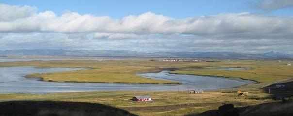 Séð yfir Hvanneyrarland úr suðri; Andakílsá liðast fram og gerir tangann Kistu langt til að eyju. Í Kistu er fornt eyðibýli.1