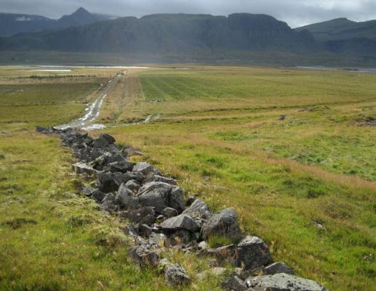 Yfir garð um gamla Nátthagann á Stekkjarholtunum og til hægri við vegarslóðann sjáum við minjar um hagabætur sem nýlunda þóttu um miðjan sjöunda áratuginn: Herfaðar brautir sem aka mátti dráttarvél með áburðardreifara. Á myndinni má sjá áhrifin.