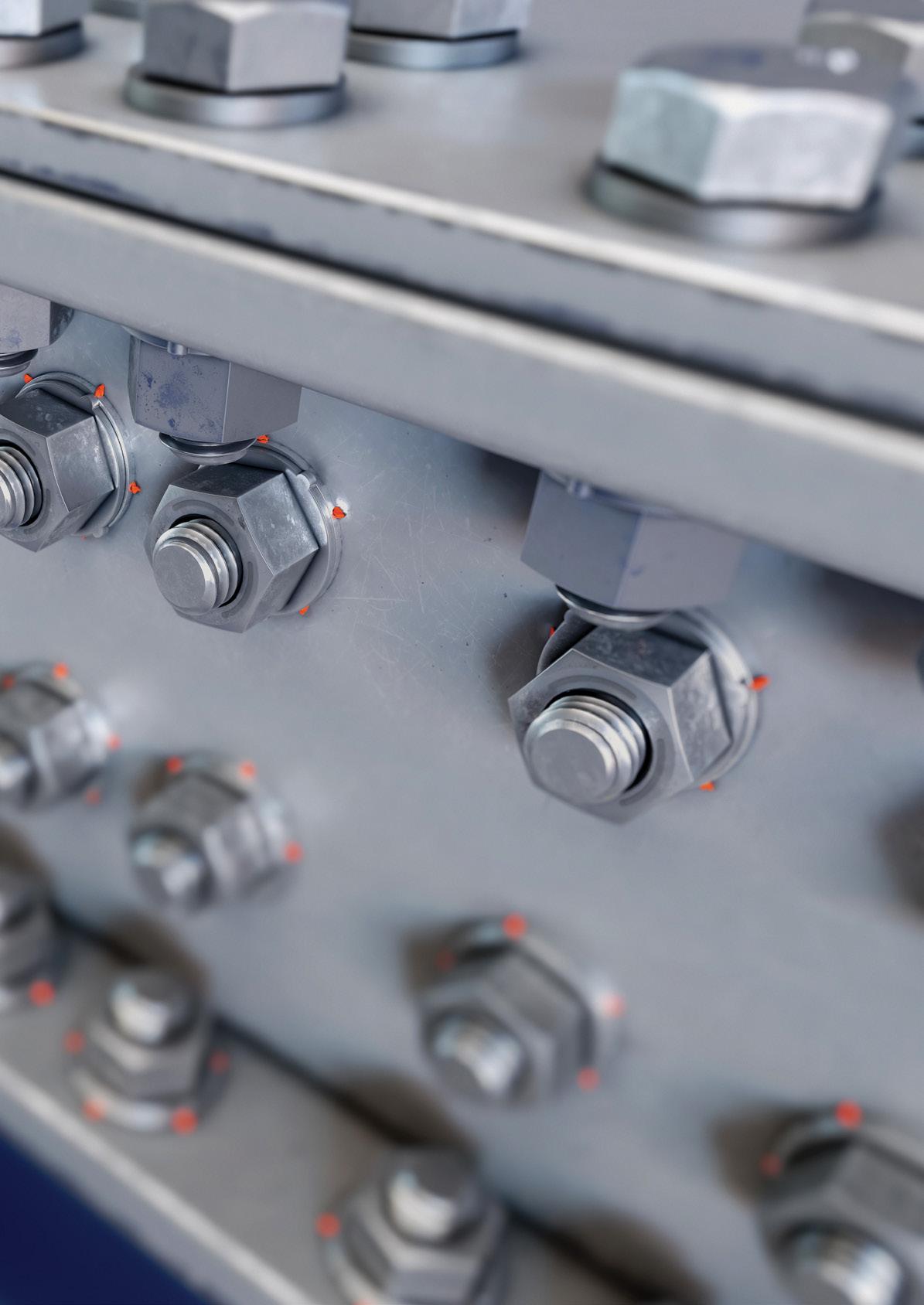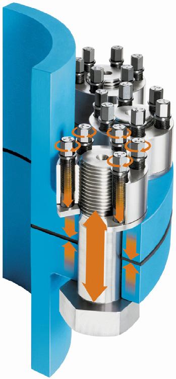 The jackbolts transfer the preload evenly into the main thread and, onto the joint. The main thread is tightened in pure tension. The multi-jackbolt tensioners offer you simple and cost-effective tightening for large size bolts.