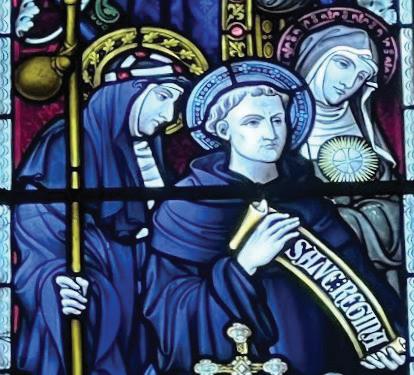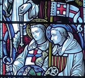 Arundel Cathedral includes images of over one hundred identifiable saints in its windows, as well as the numerous individuals from the Old Testament and Early Church featured in the carved roundels high up on each side of the nave and round the sanctuary. The Cathedral is similarly well-supplied with angels, with seventy-two pictured in the windows, and several others carved in stone. The Window of Founders of Religious orders, the subject of this issue, includes twenty-one men and women, and the similar Window of Royal Saints, above the door to the shop, another twenty-three.