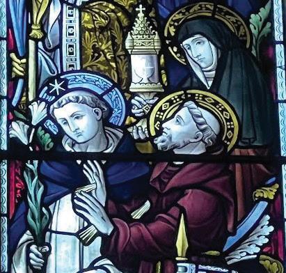 On the left is St Dominic (1170 - 1221), founder of the great Order of Friar Preachers, or Dominicans, as well as an order of Dominican nuns. After Dominic’s death a tradition developed that it was he who introduced theRosaryto the world, having received it in a vision from the Virgin Mary and the Christ Child. He is shown with a rosary, and a lily representing chastity.