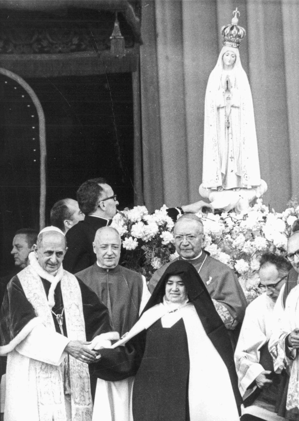 Pope Paul VI holds the hand of Sister Lucia as they stand at the base of the statue of Our Lady of Fatima in the Basilica at Fatima