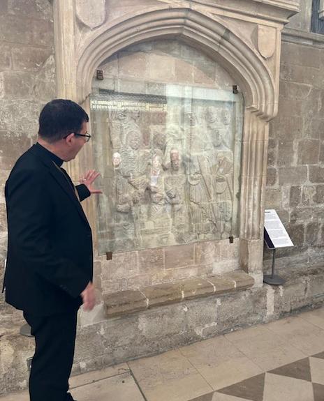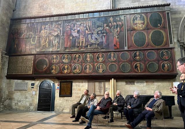 Following the Mass, the Dean of Chichester Cathedral, the Very Rev Dr Edward Dowler, gave us a guided tour of the cathedral. We began in the Baptistry which holds a splendid new copper font and a painting of the baptism of Christ by Hans Feibusch. The Dean discussed the Lazarus relief on the wall.