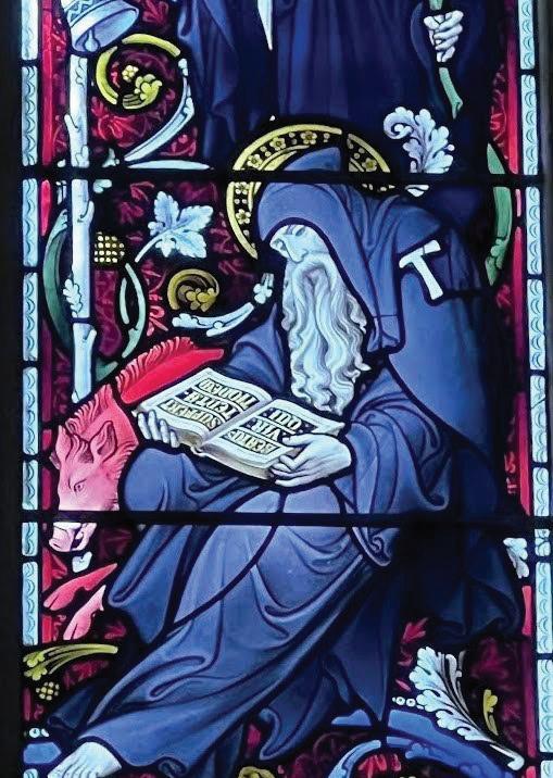 Below St Scholastica in the right hand frame is St Anthony (251 - 356), as shown on the front cover, a hermit regarded as ‘the father of all monks’, whose years as a swineherd are the reason for the inclusion of the splendid boar. Though Anthony himself did not found a monastery a community grew around him based on example of living an ascetic life detached from the world.