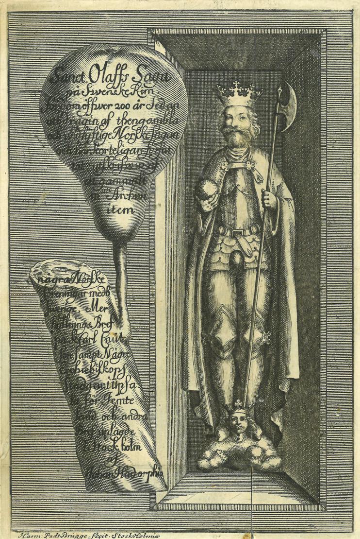 Brugge (også: Padtbrugge), som var fødd i Amsterdam 1656 og døde i Stockholm 1686. Han vart tilsett som gravør i Antikvitetskollegiet i 1674, så han var eit naturleg valg for Hadorph til dette oppdraget. Herman var truleg son til gravøren Dionysius Padtbrugge (1628-83) som kom til Sverige 1672. Tittelbladet er så stort at det må brettast ut, og boktittelen er gravert innanfor ei pære(!) som heng opp-ned på ein kvist som også er gravert med tekst. Bakgrunnen viser ein St. Olavsfigur frå 1400-talet i Jumkils kyrka («Jomakil») ved Uppsala, og denne figuren står enno i dag i kyrkja på sørsida av altaret. (Fig. 1)