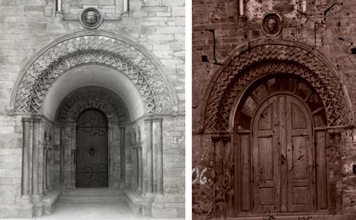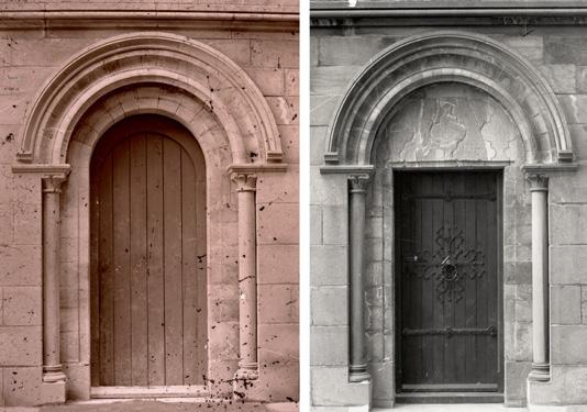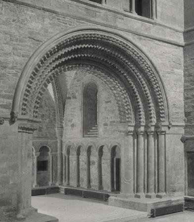 Fig. 5: Johanneskapellet etter restaurering, med dei kraftige chevron- eller sikksakkbogane i inngangsbogen og på kvelvribbene. Halvsøylene har foldekapiteler, og den ytre dekkbogen er avslutta med dyremasker. Arkivfoto 7006